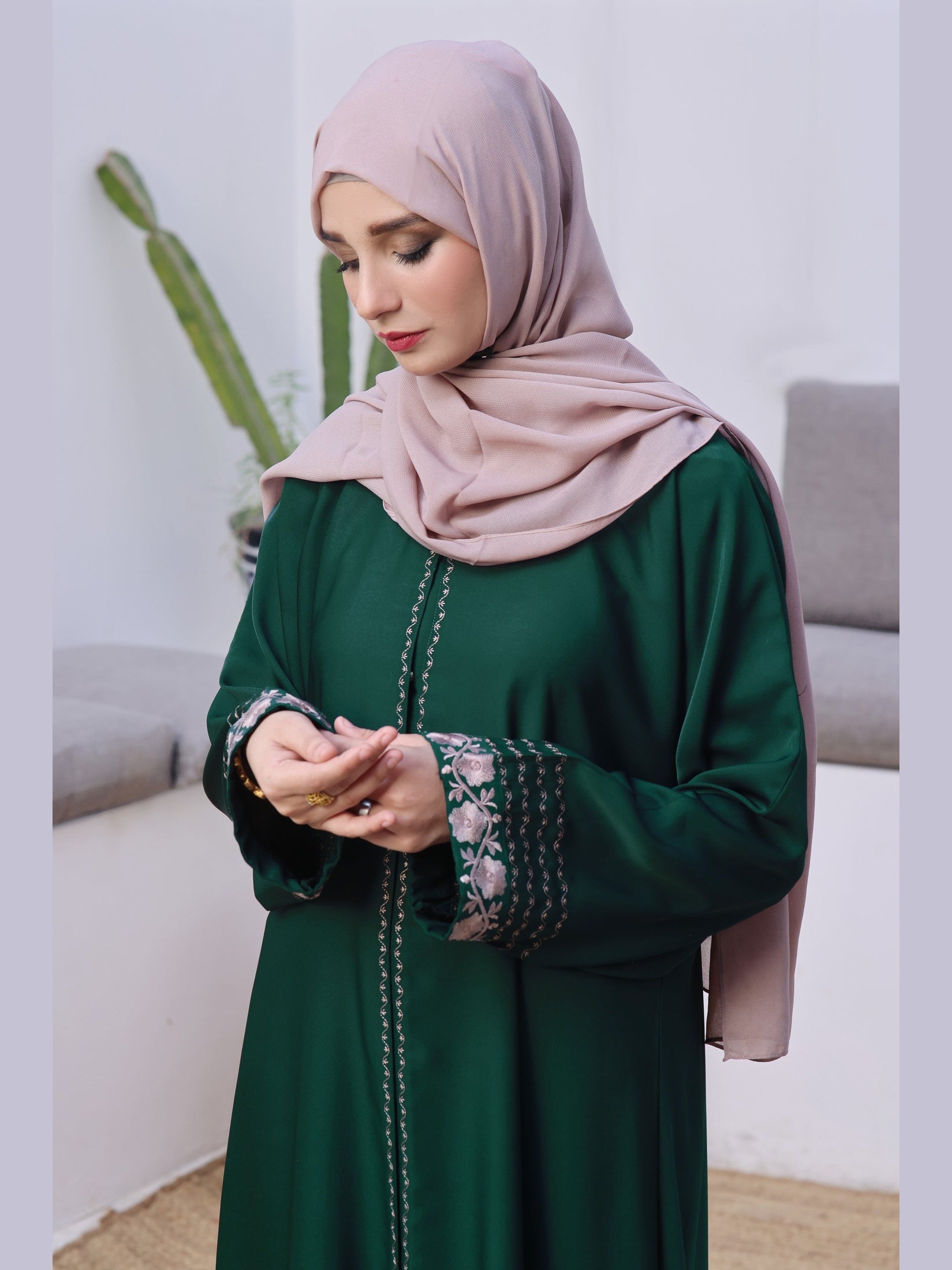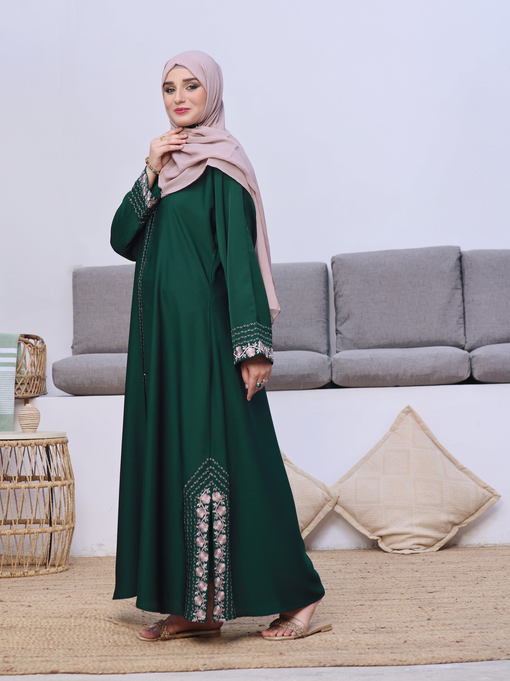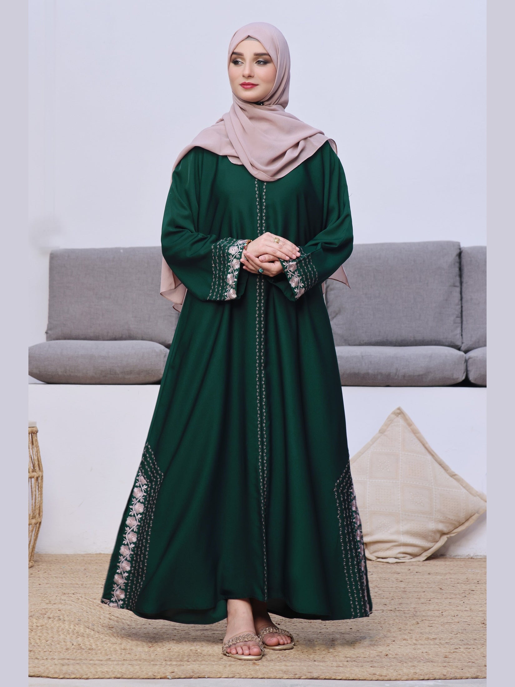 Our beautiful front open style is constructed on imported fabric which is soft and durable, fabric manipulation is done on bodice with flower embroidery on front and sleeves making it flouncy and elegant, comes along with Contrast chiffon Sheila