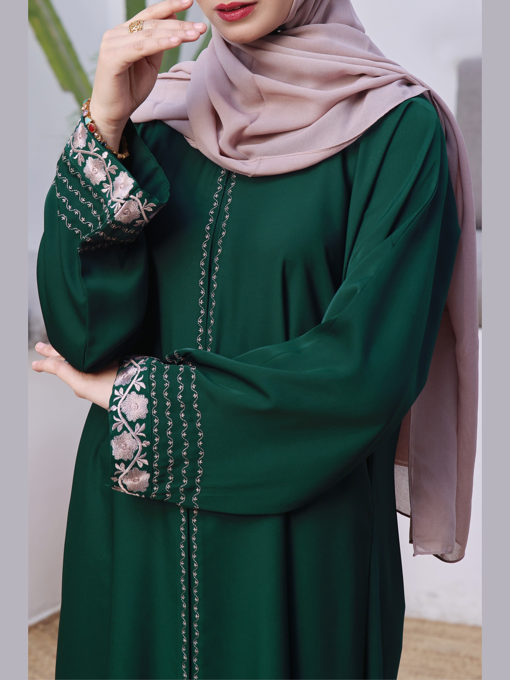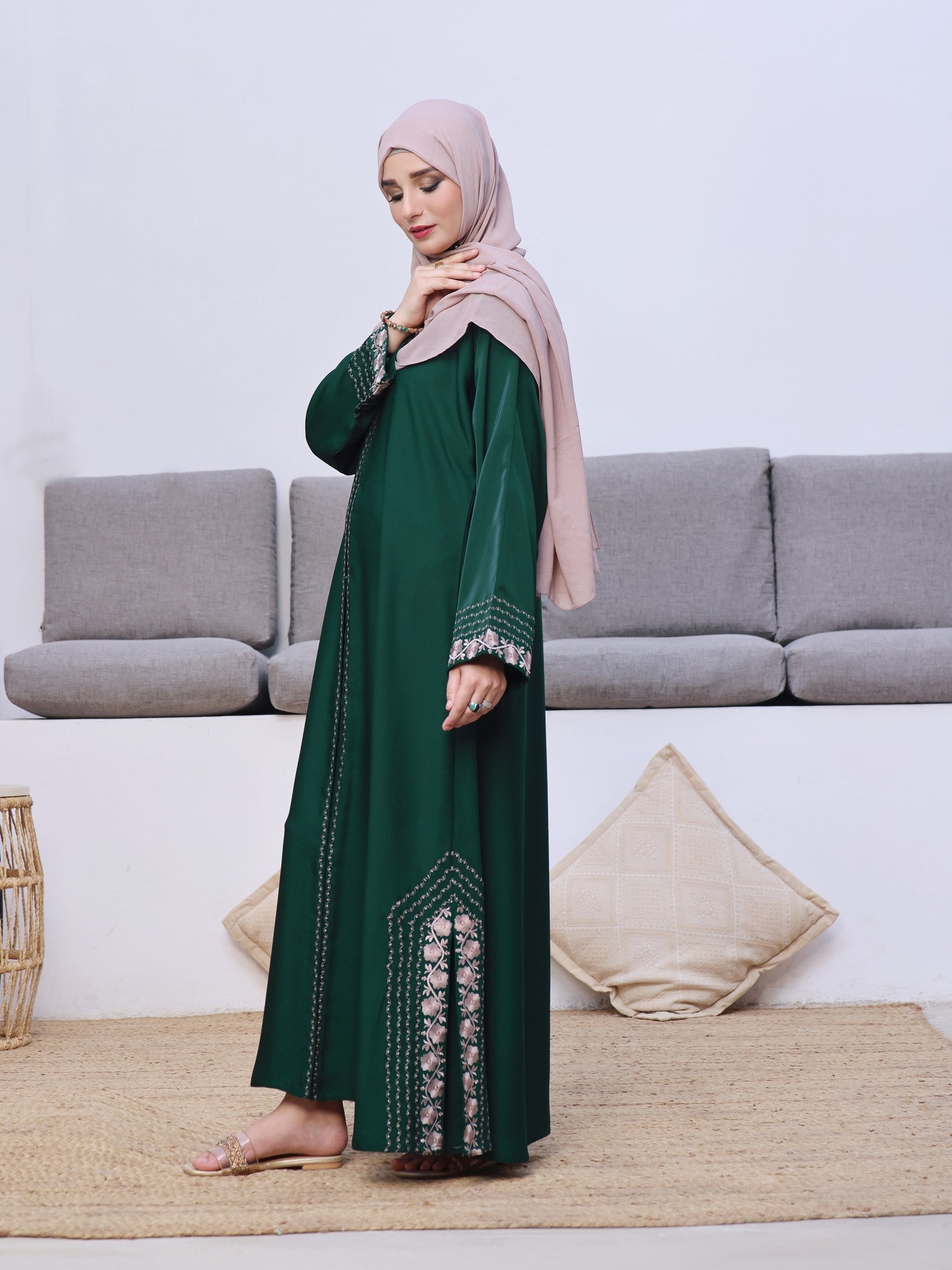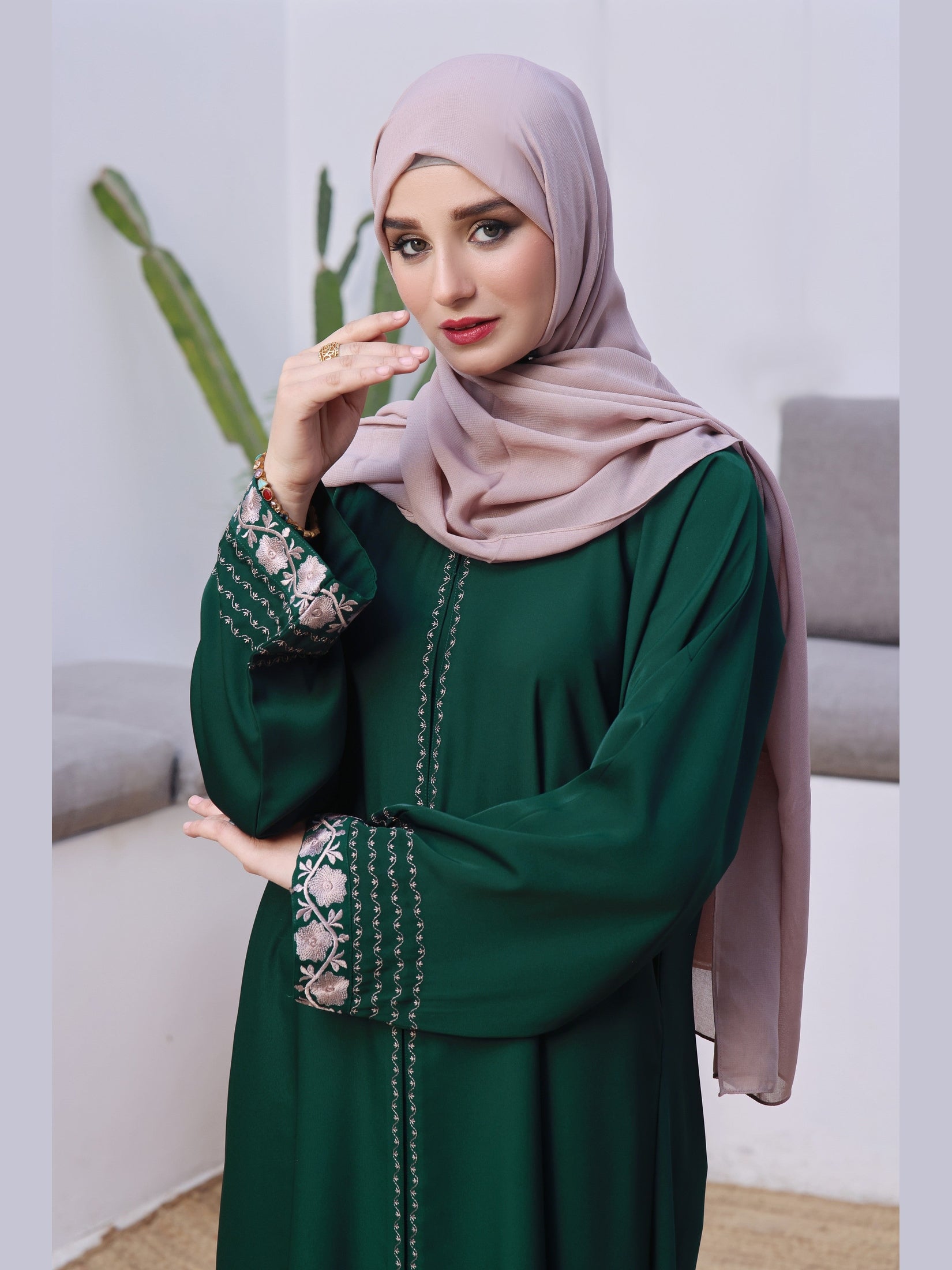 Our beautiful front open style is constructed on imported fabric which is soft and durable, fabric manipulation is done on bodice with flower embroidery on front and sleeves making it flouncy and elegant, comes along with Contrast chiffon Sheila
