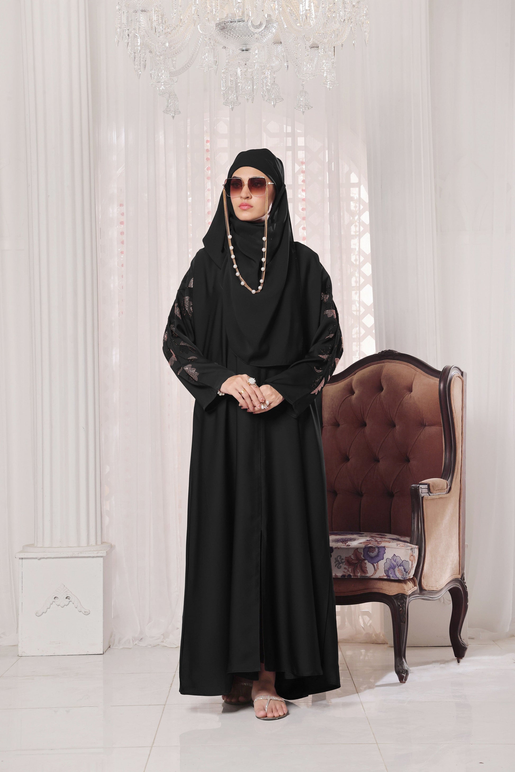Comfort & Style Combined: Premium fabric ensures ease of movement while maintaining an elevated appearance. Turn heads with this stunning brown abaya—where timeless tradition meets contemporary sophistication through intricate hand-applied stonework in a delicate leaf motif.