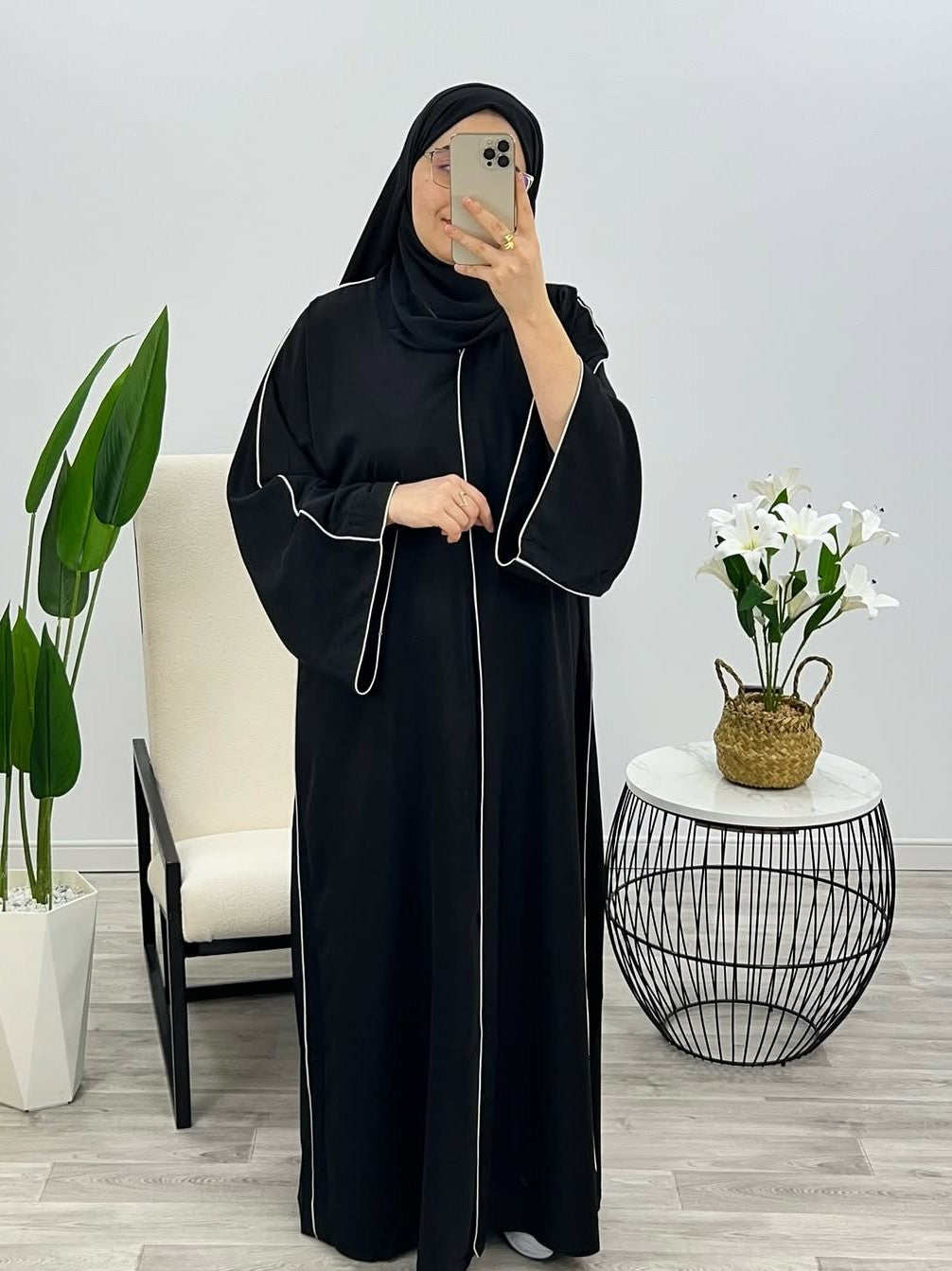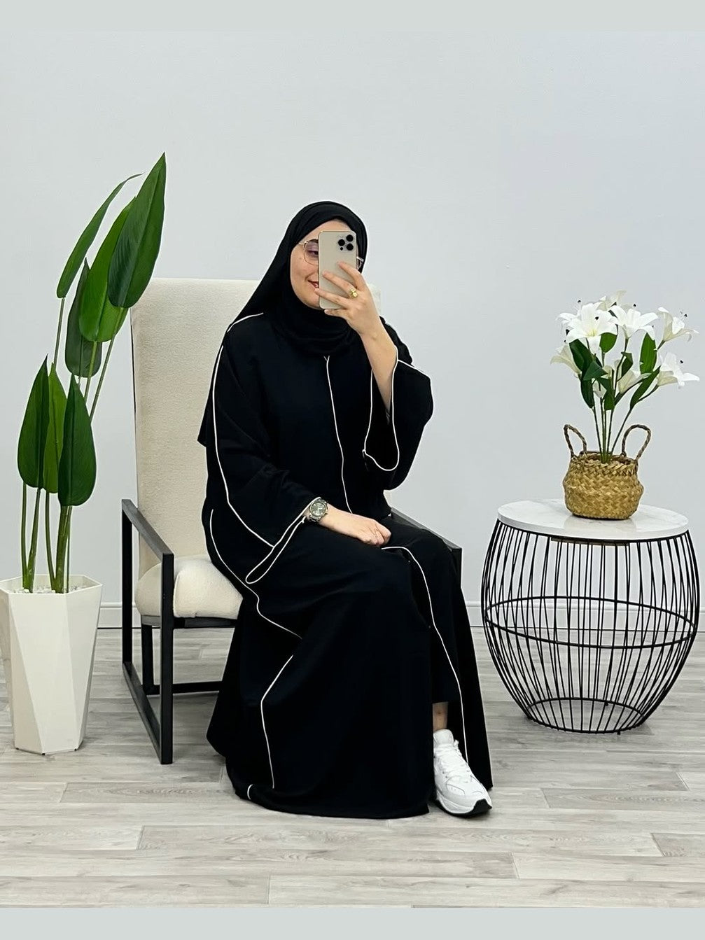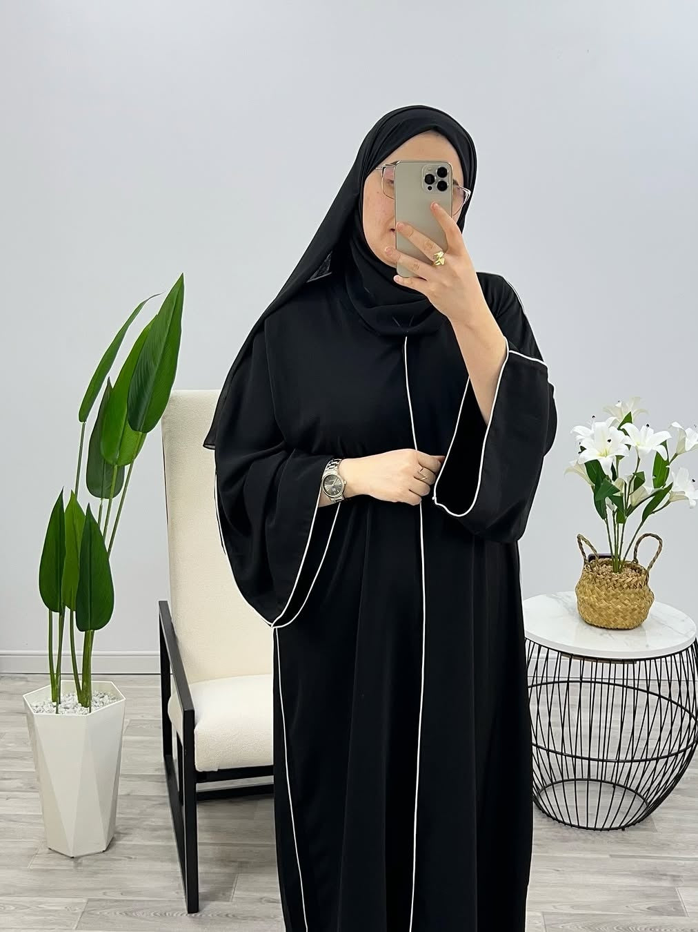 Black Premium Double Pipin Abaya Front Open with black scarf (FREE SHIPPING NOW)