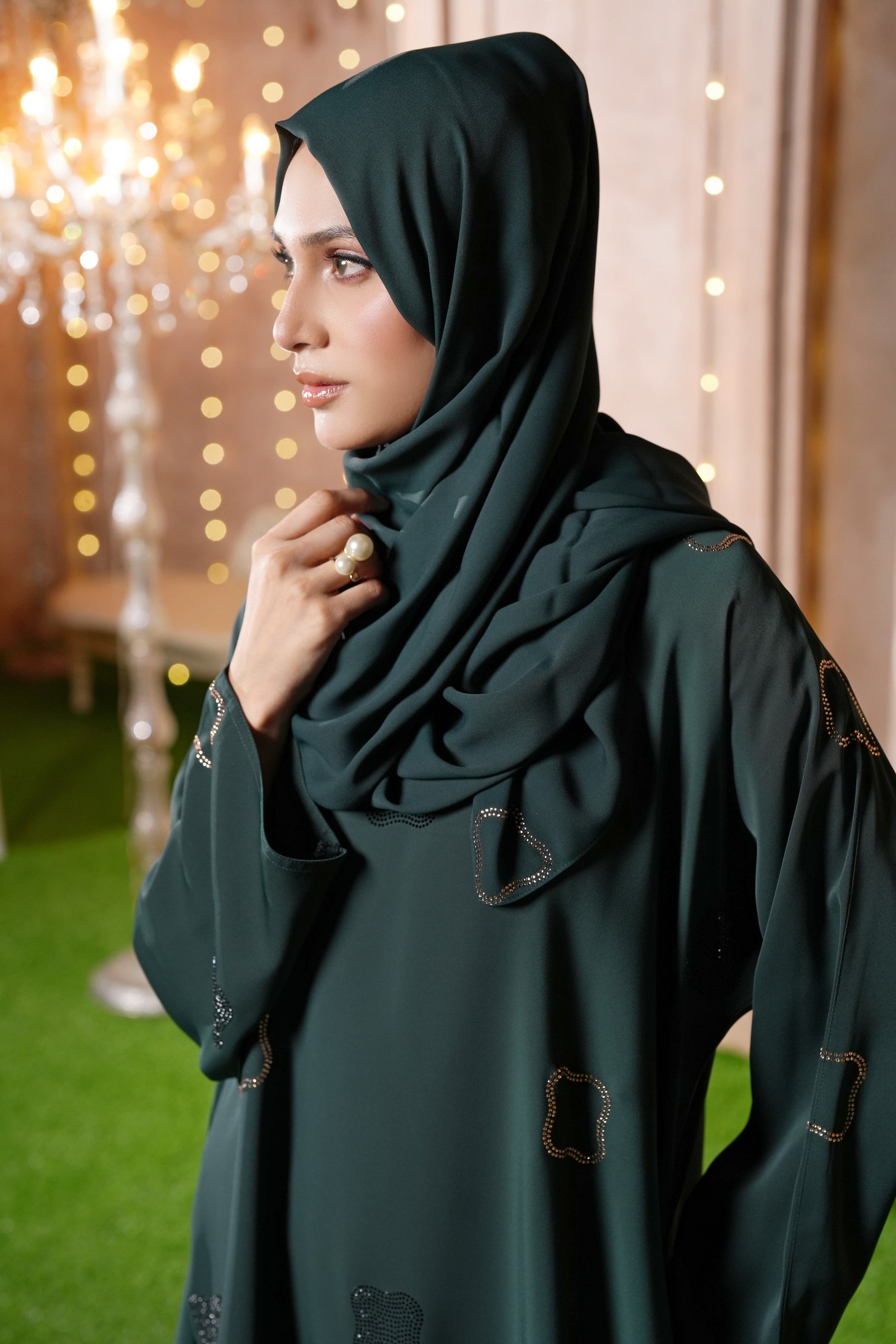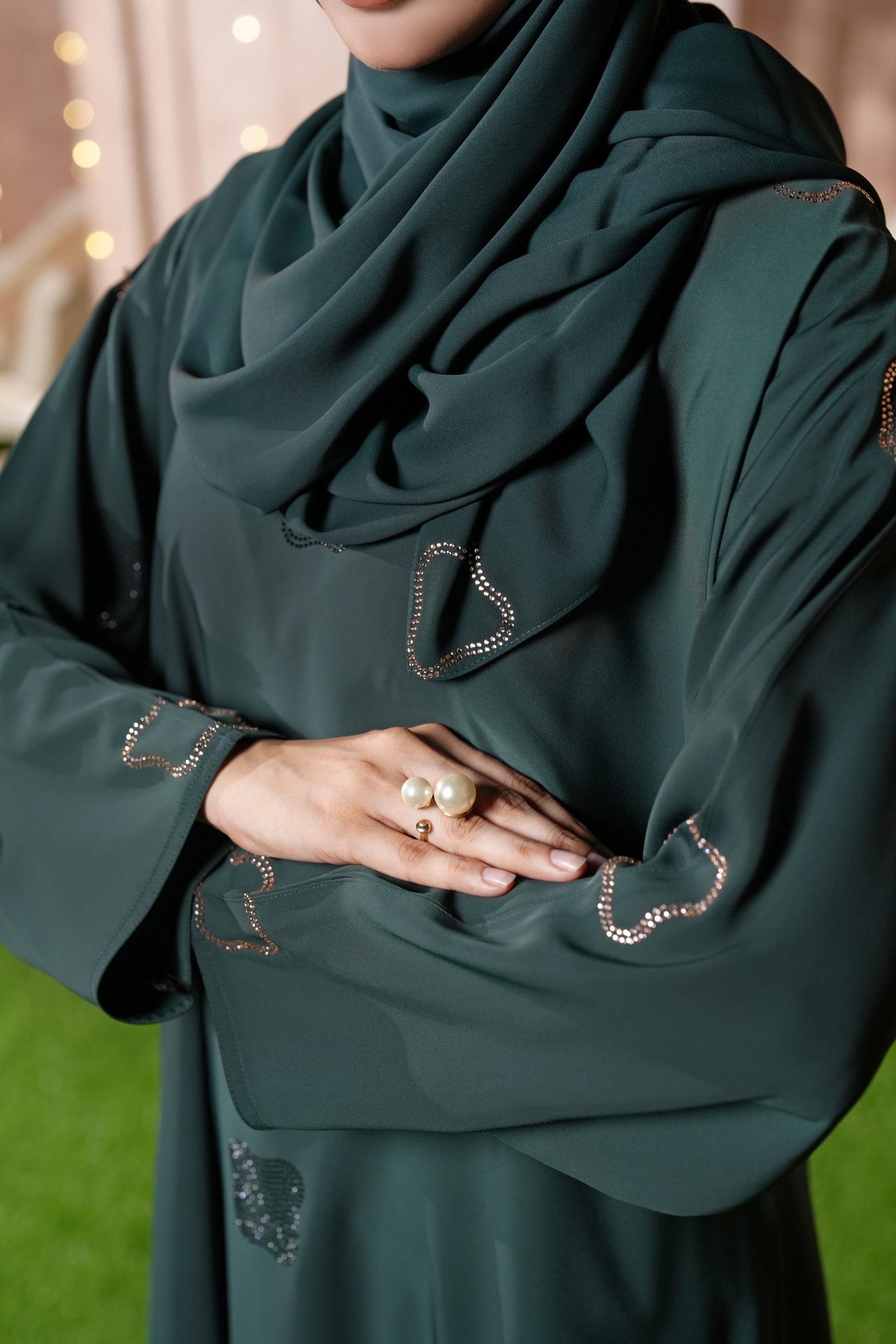 Matching Hijab Included: Comes with a soft Korean Chiffon Sheila in a matching deep green shade for a complete modest ensemble.