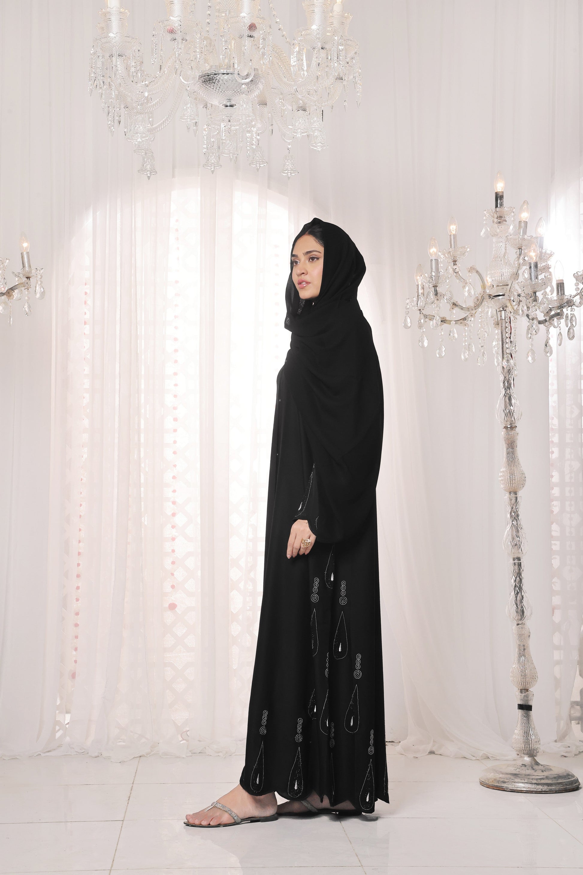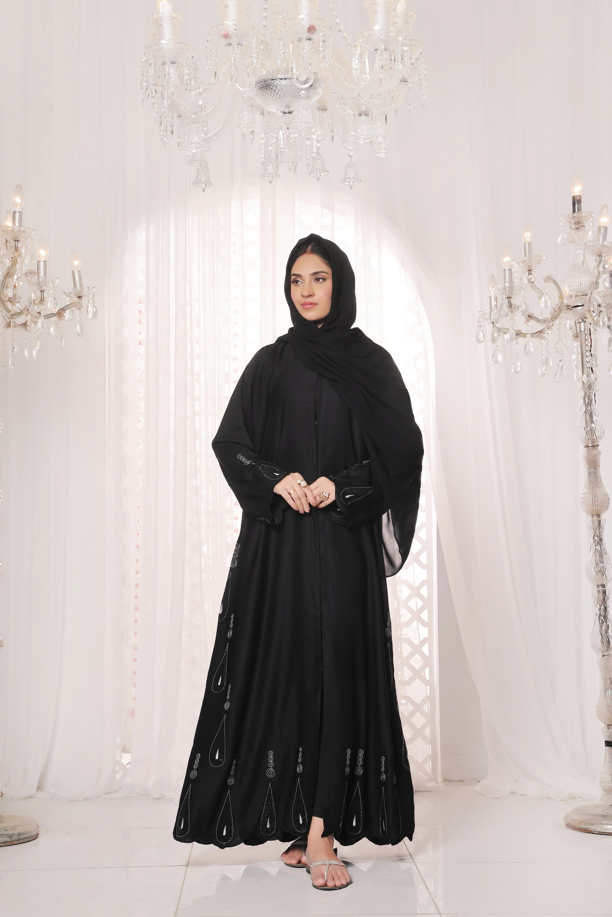 Turn heads with this stunning black abaya—where timeless tradition meets contemporary sophistication through intricate embroidered organza accents.