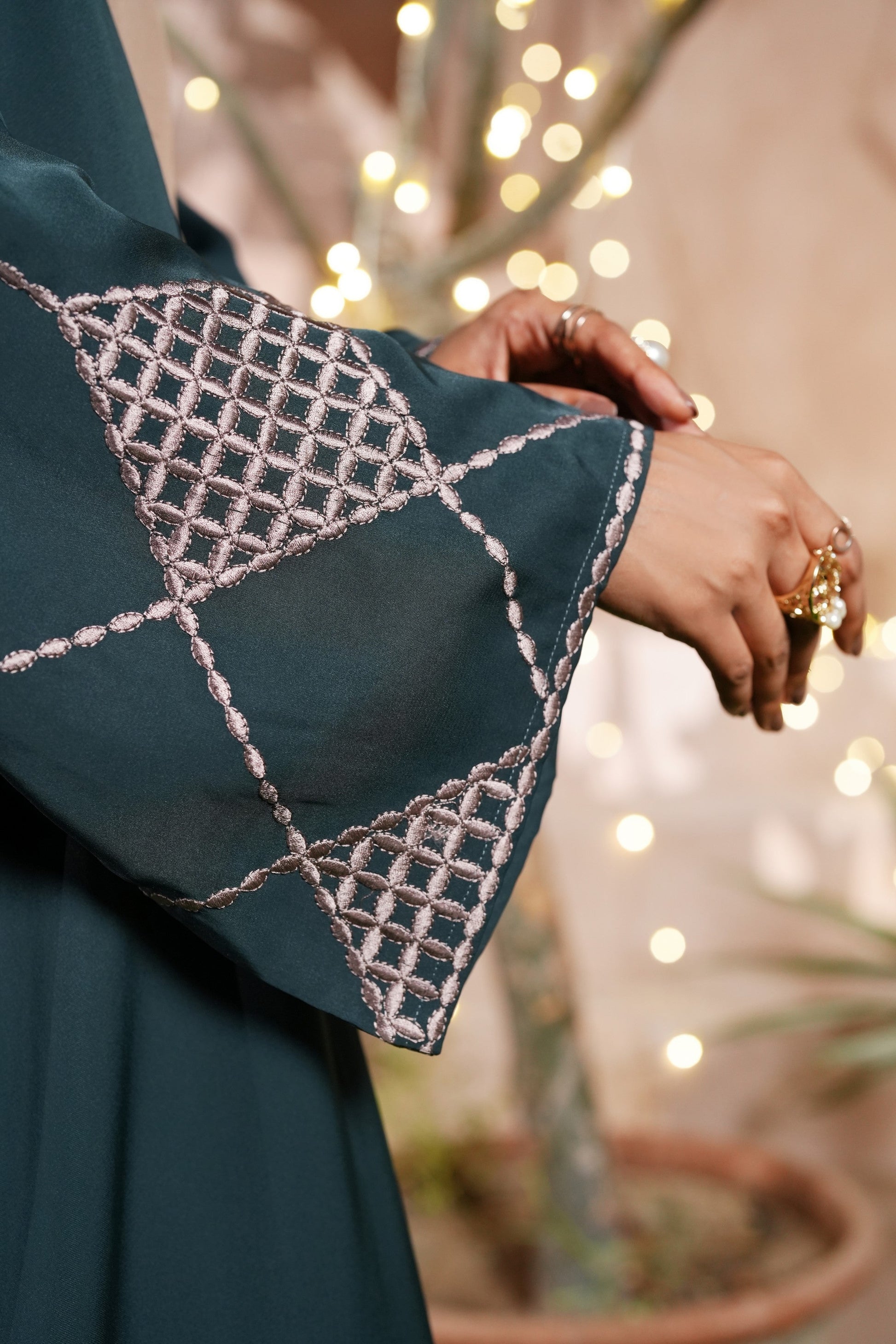 Statement Sleeve Embroidery: The wide sleeves are beautifully detailed with geometric silver threadwork, adding charm and artisanal elegance.