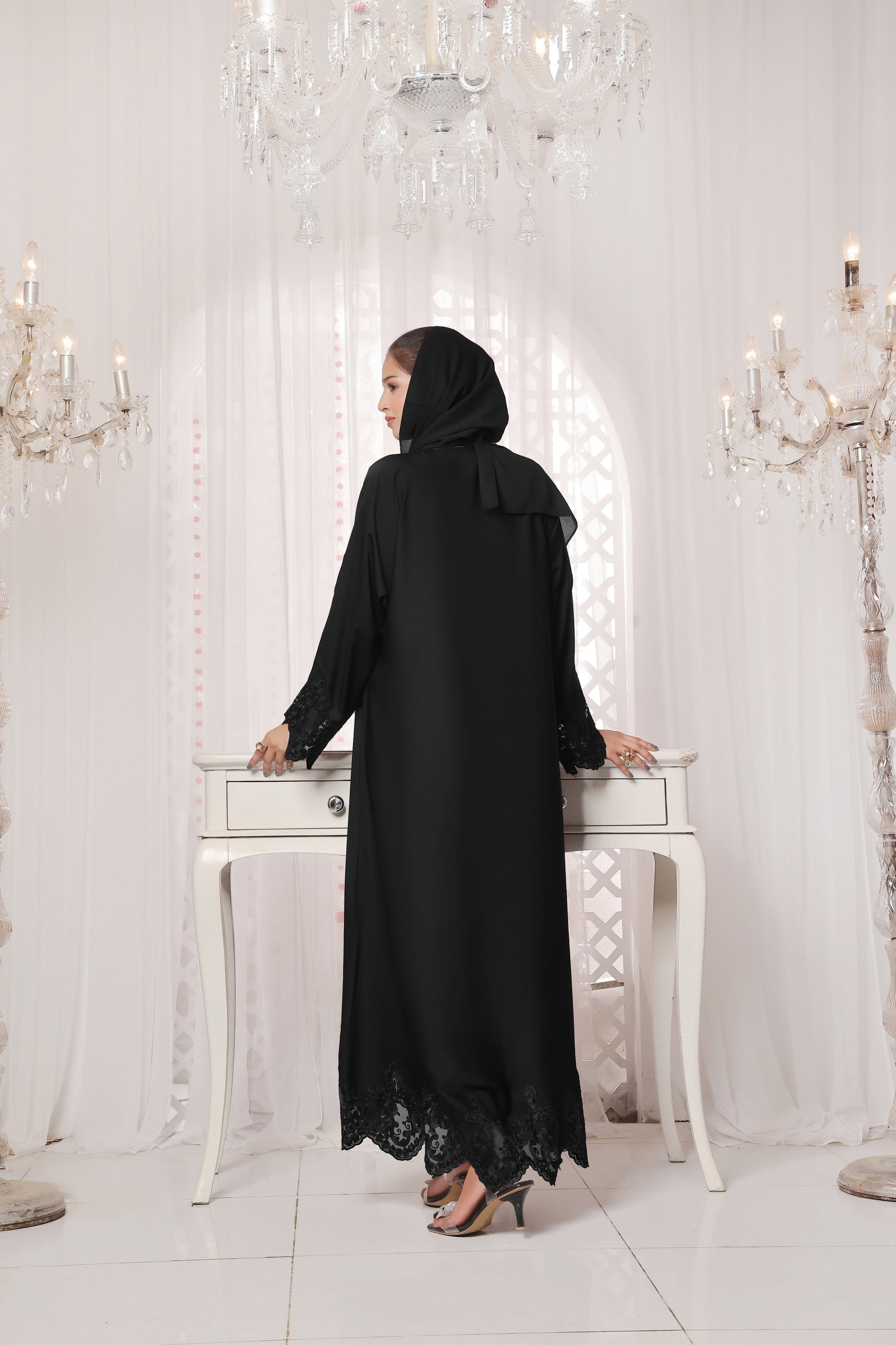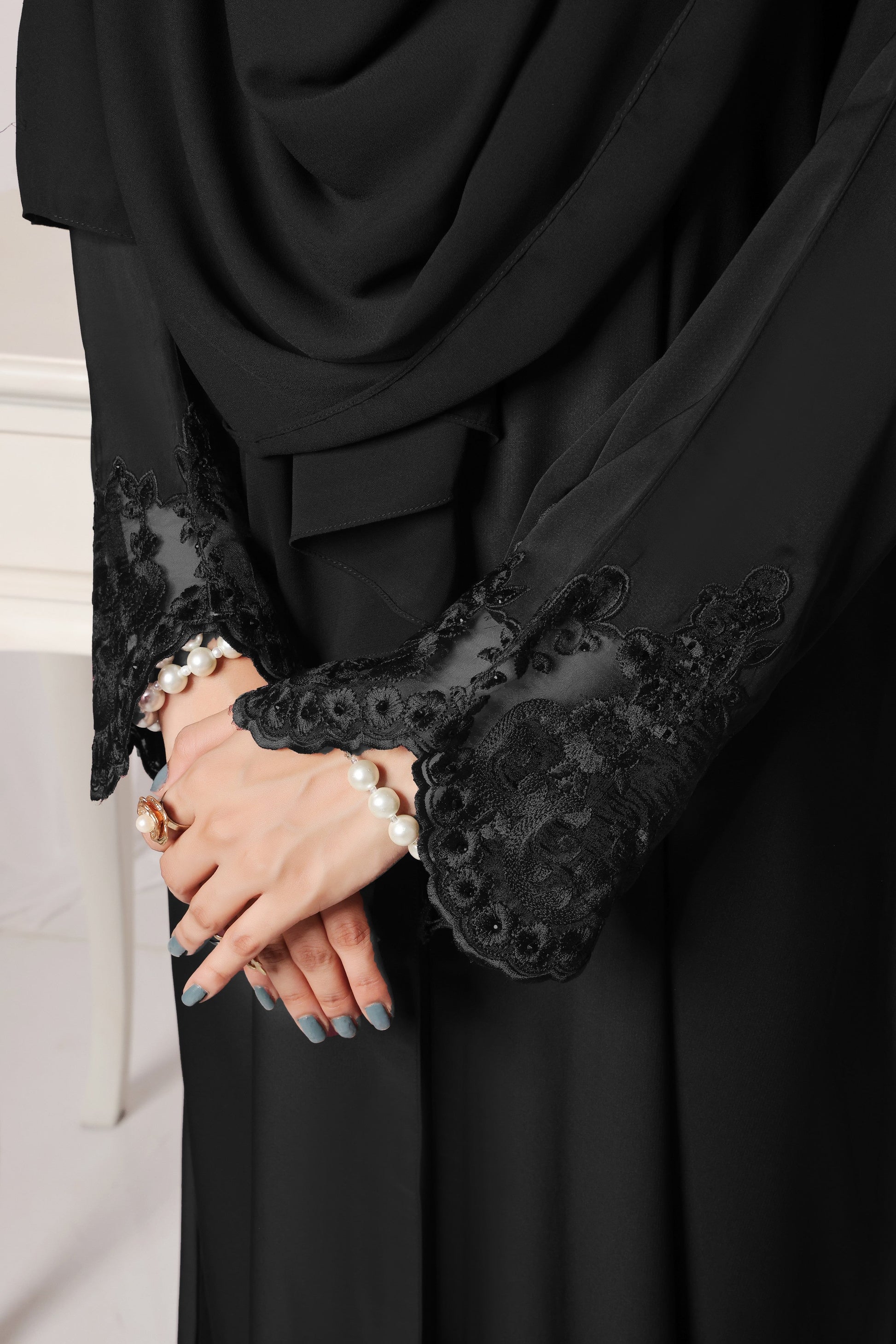 Turn heads with this stunning black abaya—where timeless tradition meets contemporary sophistication through intricate embroidered organza accents.