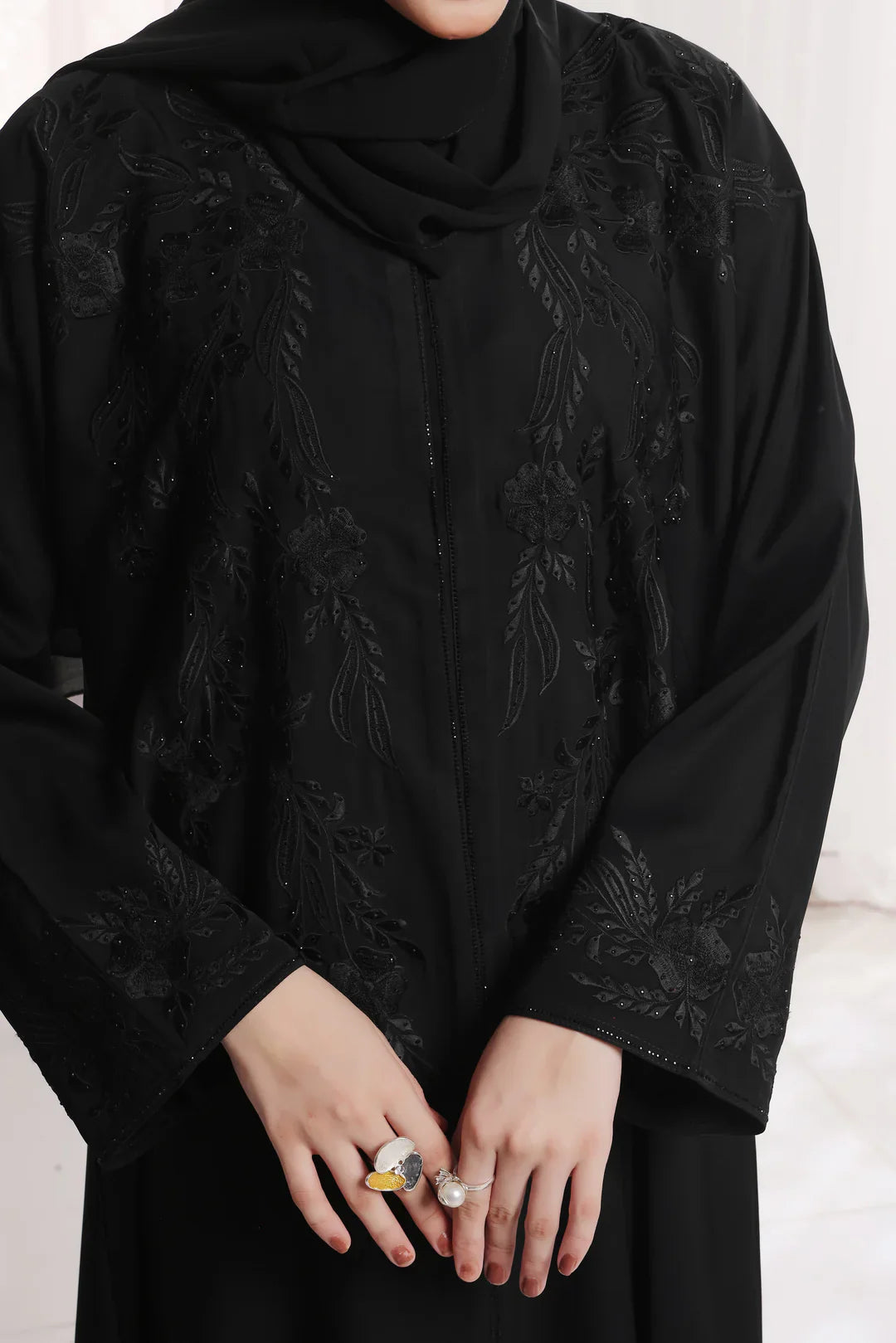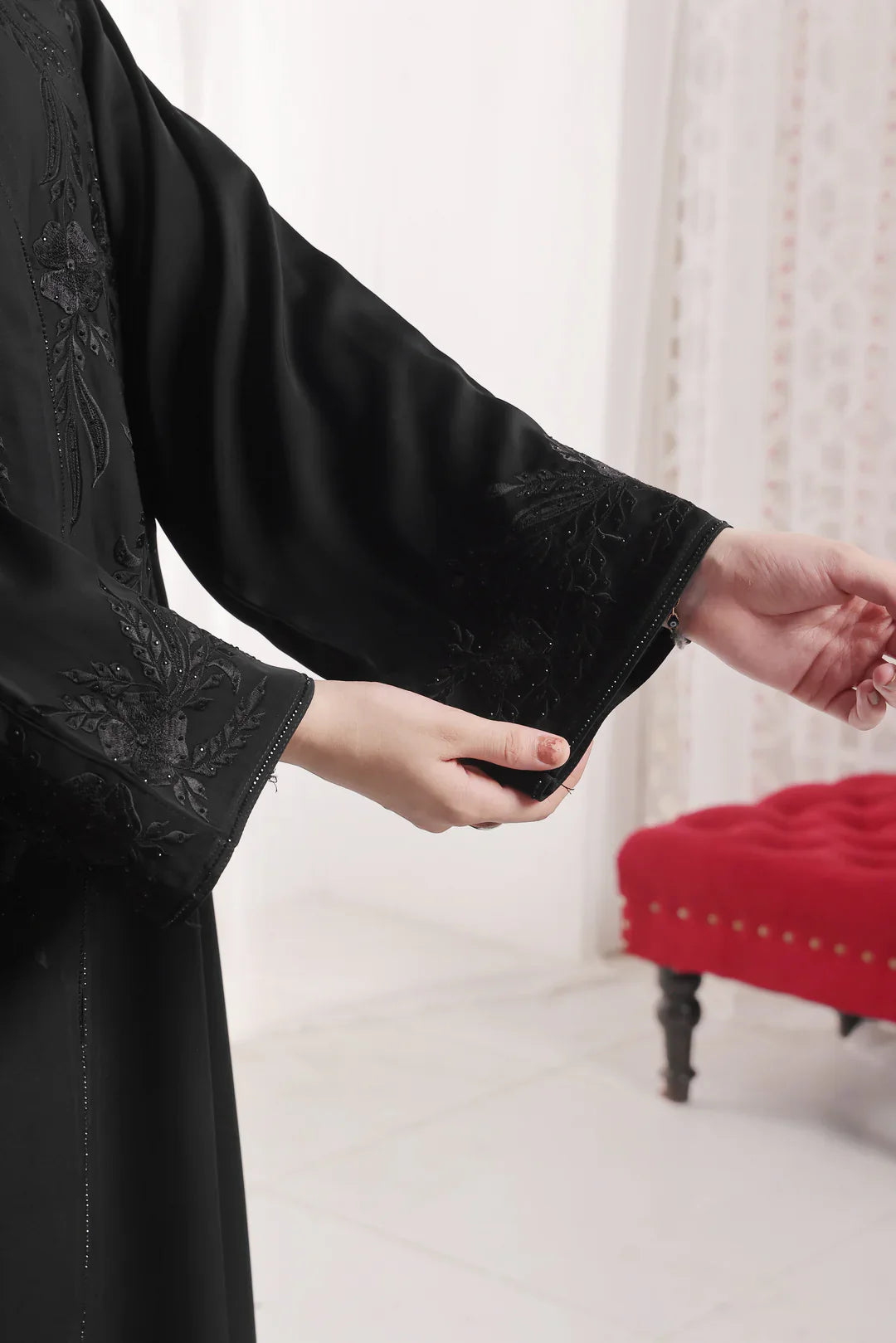 Tonal Floral Embroidery with Stone Detailing: Features intricate black-on-black floral embroidery enhanced with delicate stone work along the front and sleeves—adding a soft, graceful shimmer.