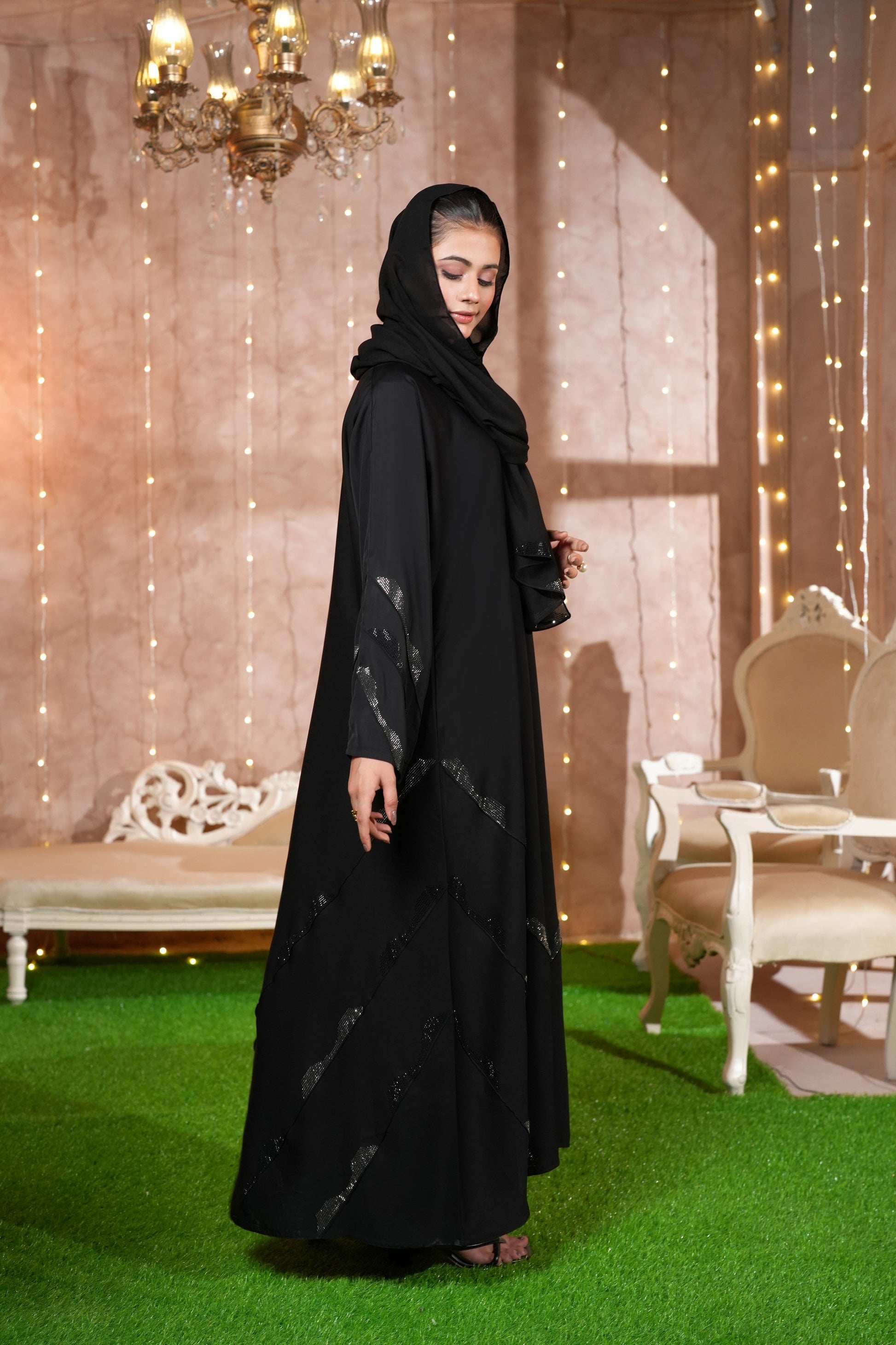 Make an unforgettable impression with this stunning pearl-embellished abaya, crafted for elegance and sophistication.
