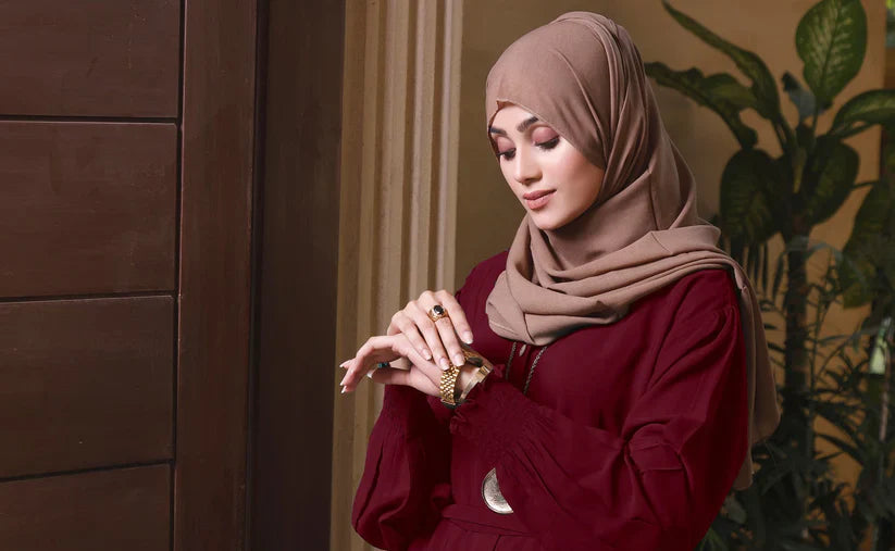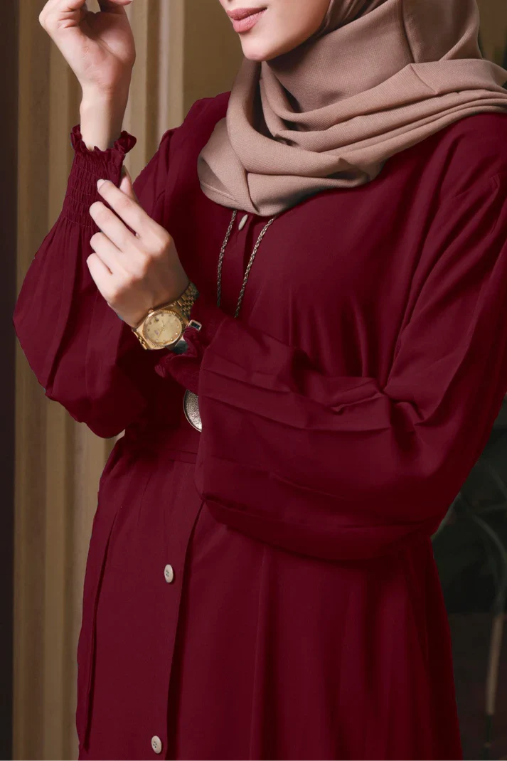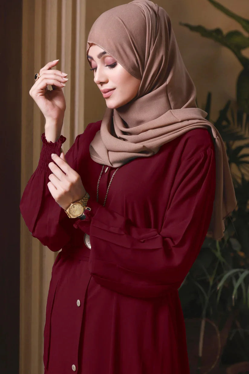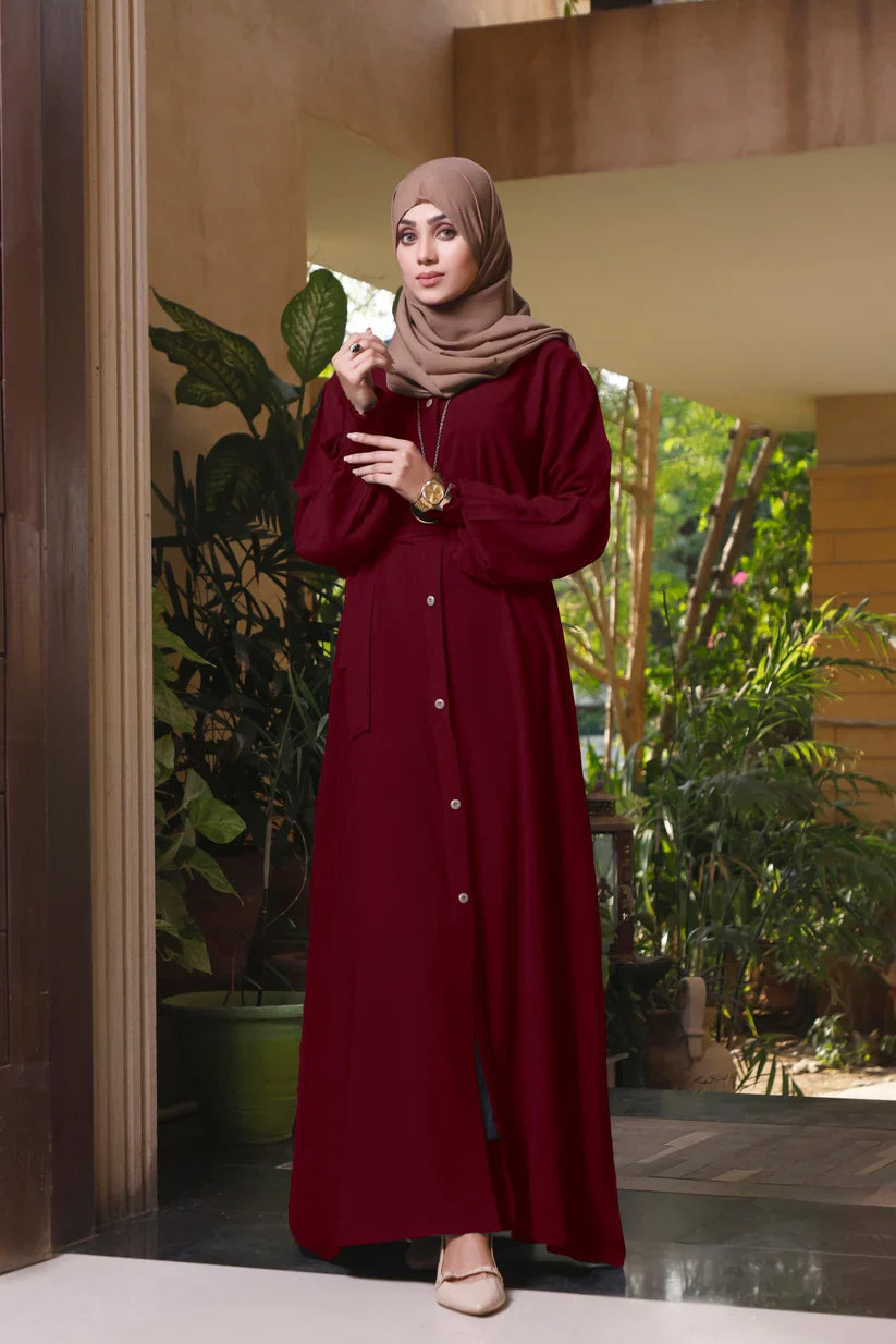 Featuring luxury at its best with our latest front open style which is stylish and elegant belt abaya design you will get compliments wherever you go with this stylish look which comes along with pure Korean Chiffon Sheila