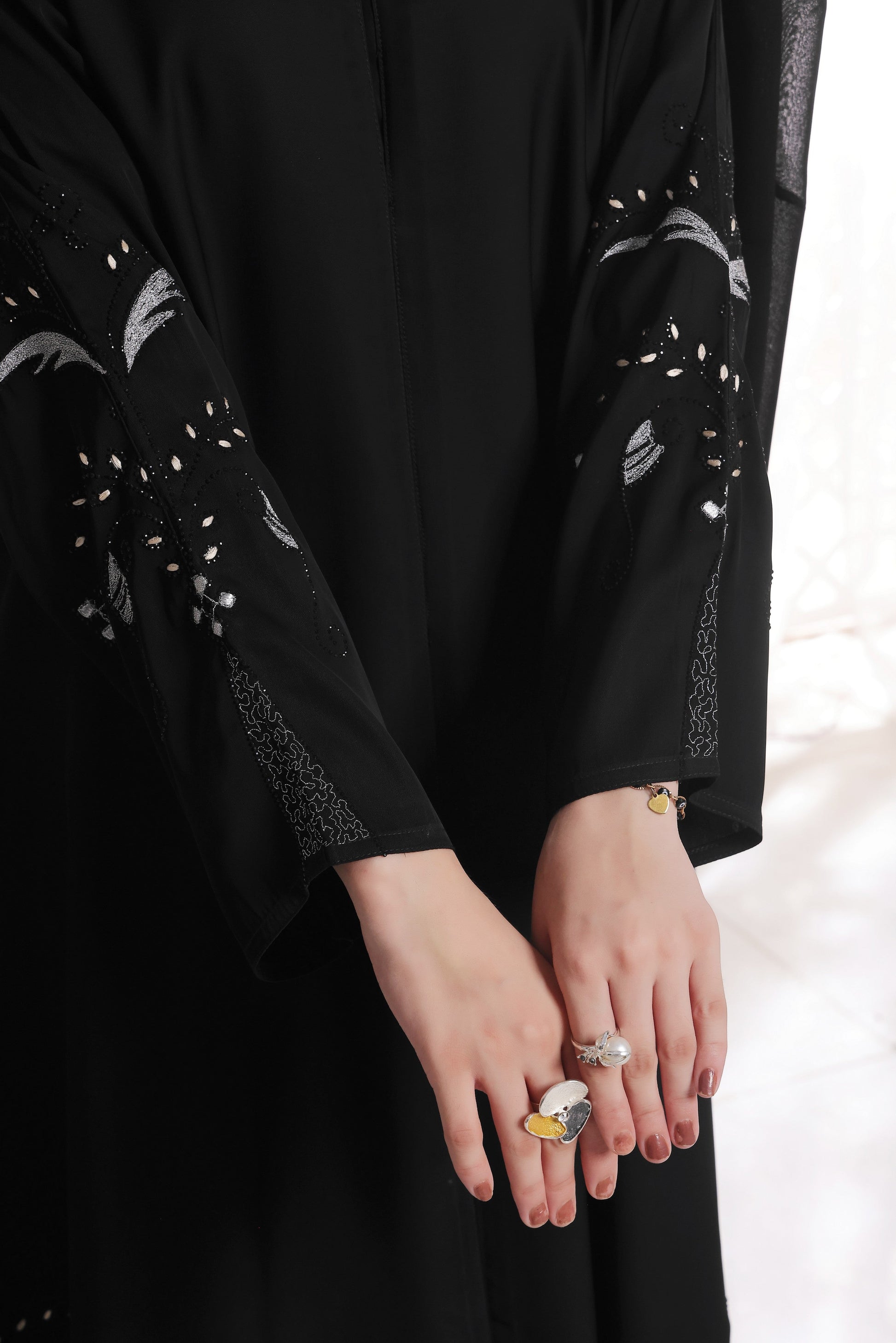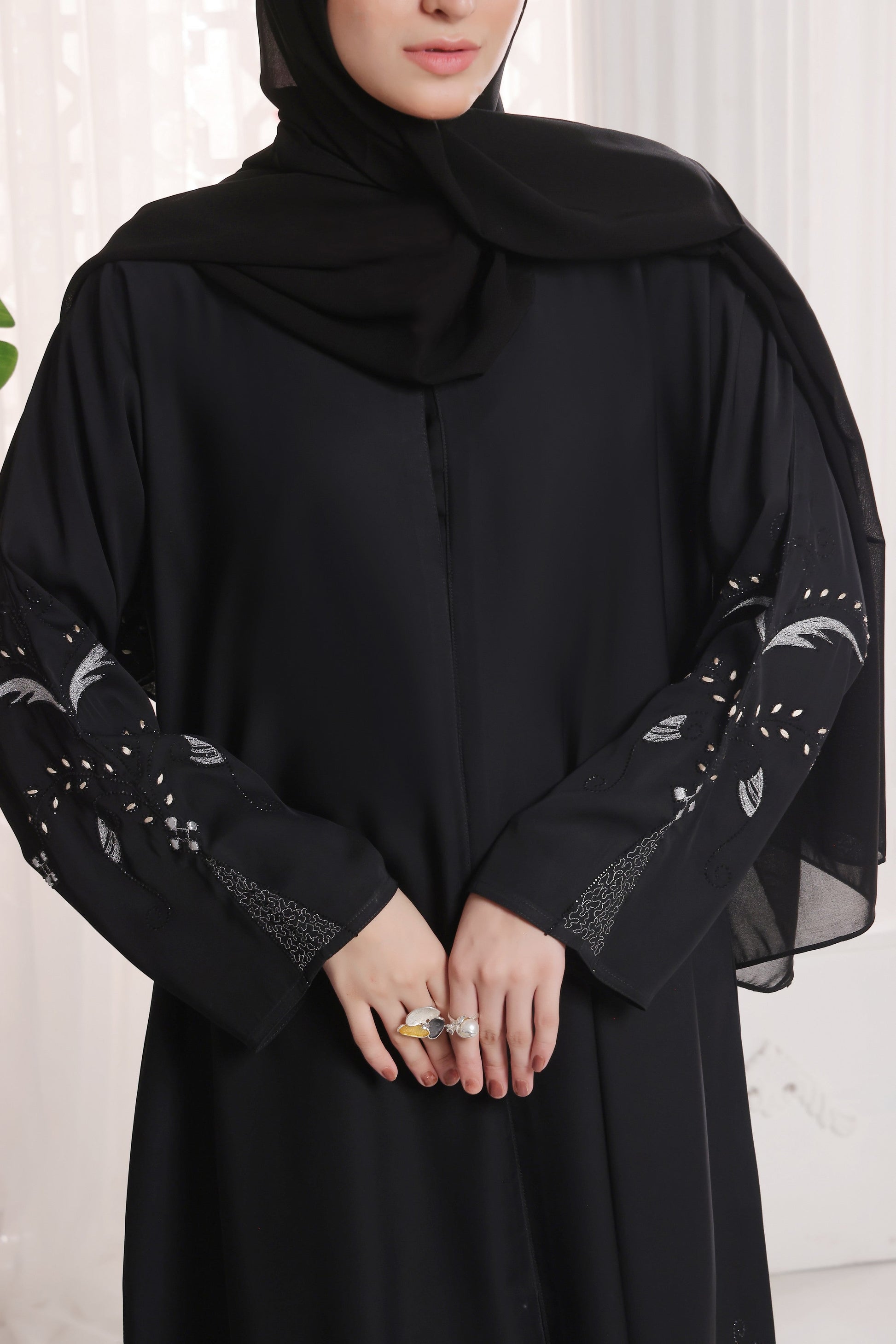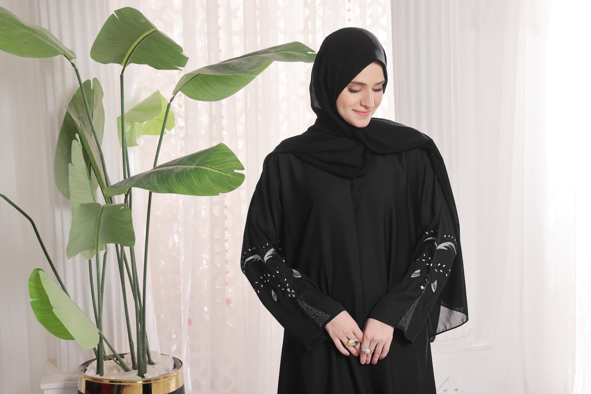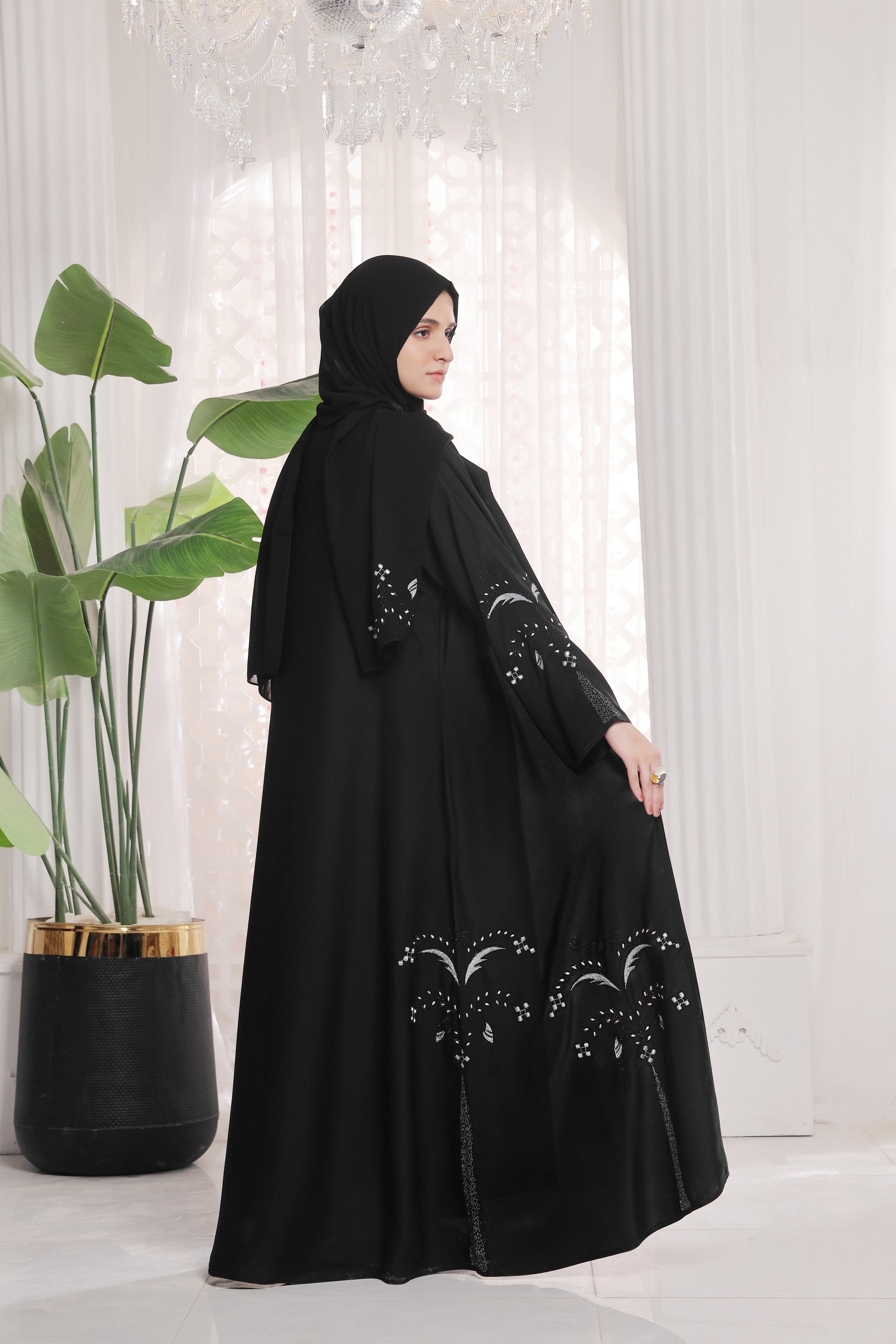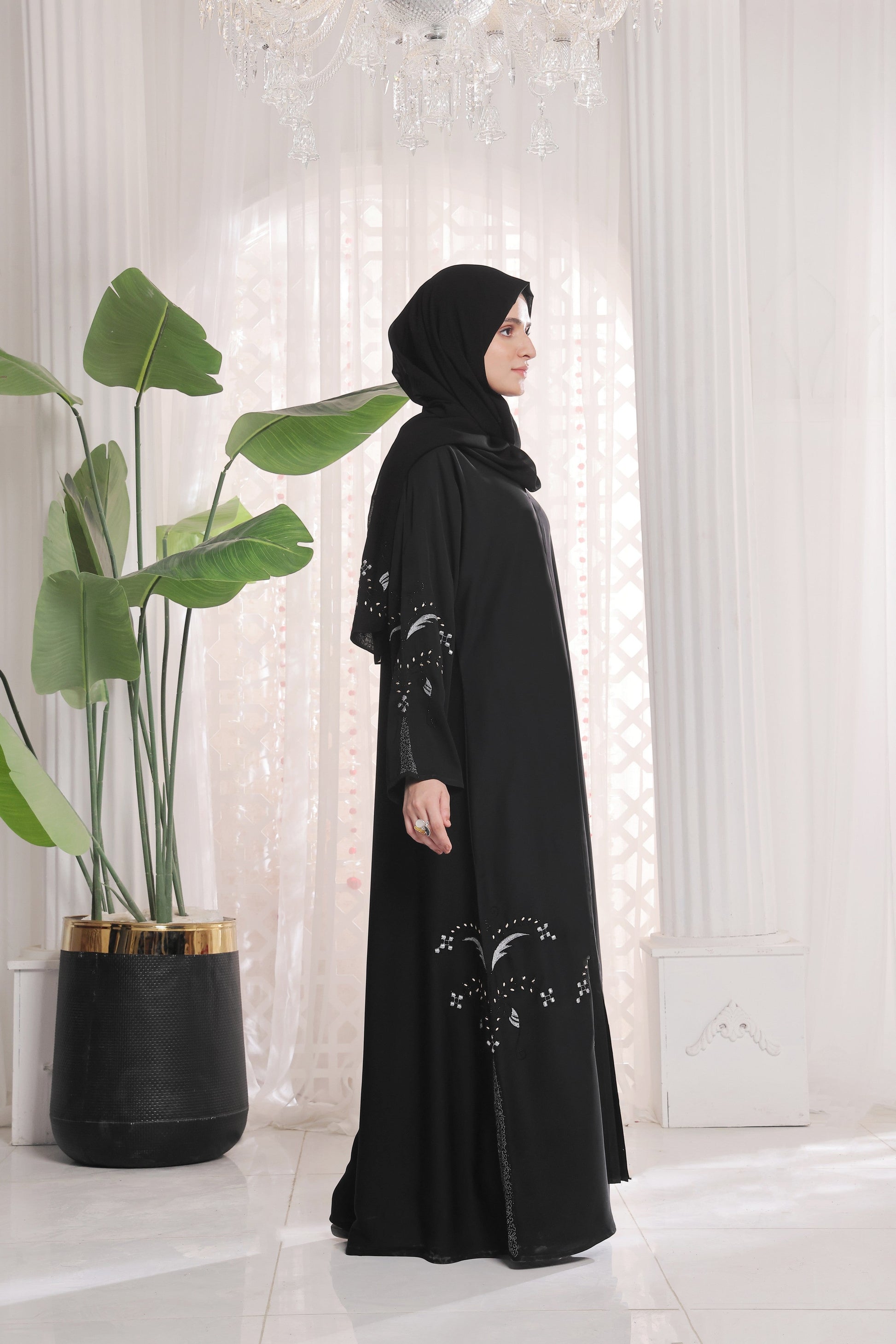 Refined Detailing: The handwork adds a unique, luxurious texture that subtly stands out. Occasion-Ready: Perfect for Eid, weddings, or any elegant evening where grace is key. Comfort & Style Combined: Premium fabric ensures ease of movement while maintaining an elevated appearance. Turn heads with this stunning black abaya—where timeless tradition meets contemporary sophistication through intricate hand-applied accents.