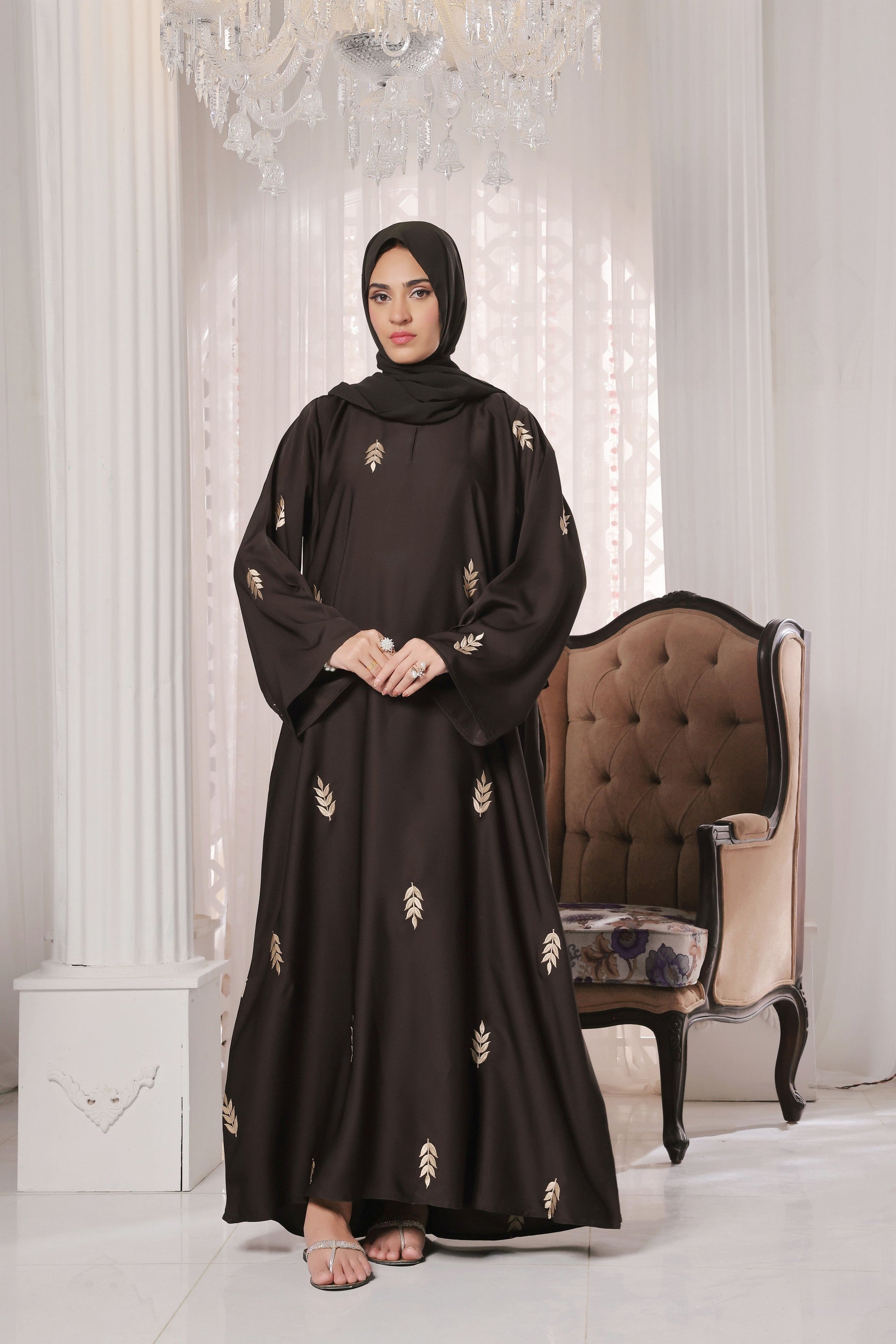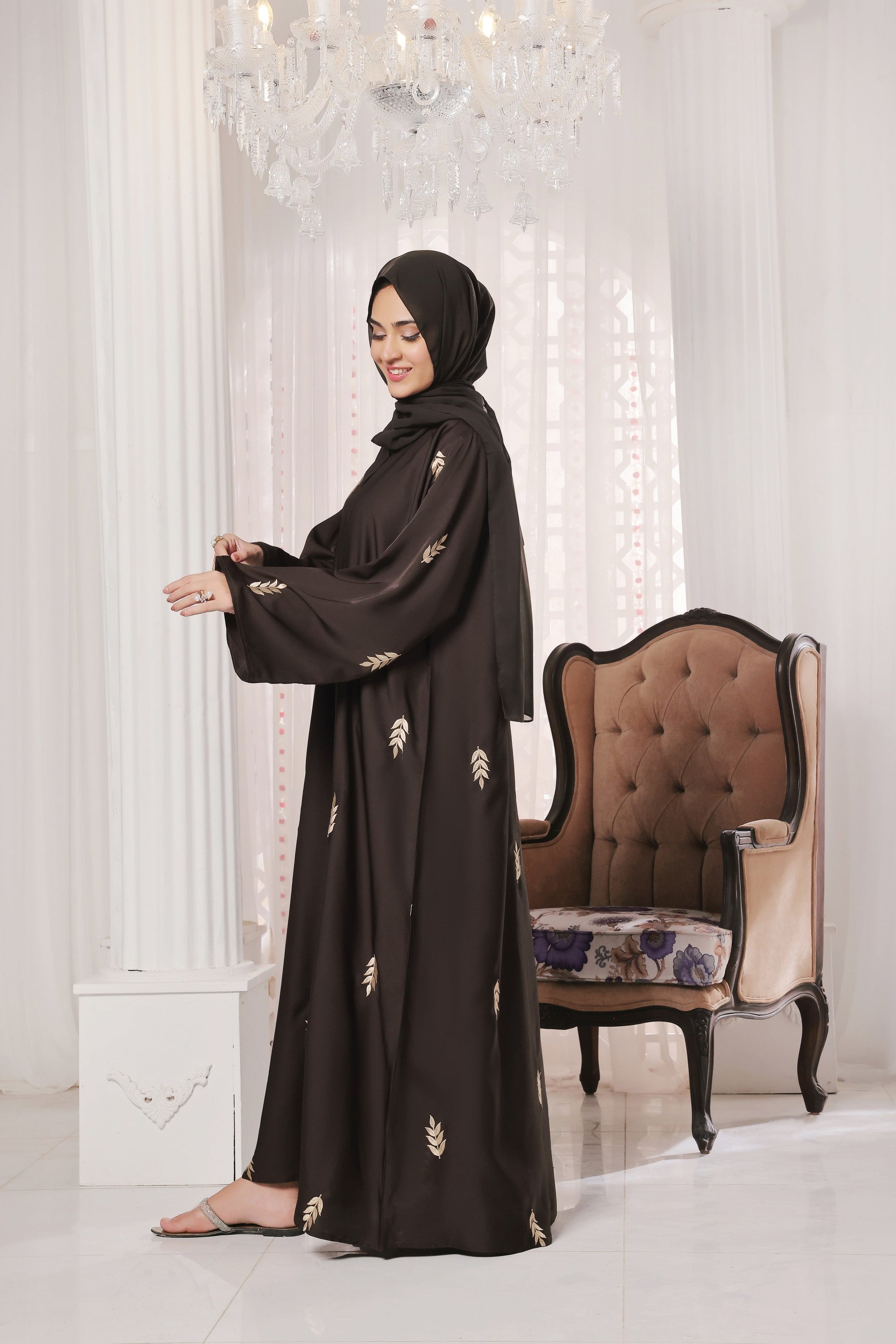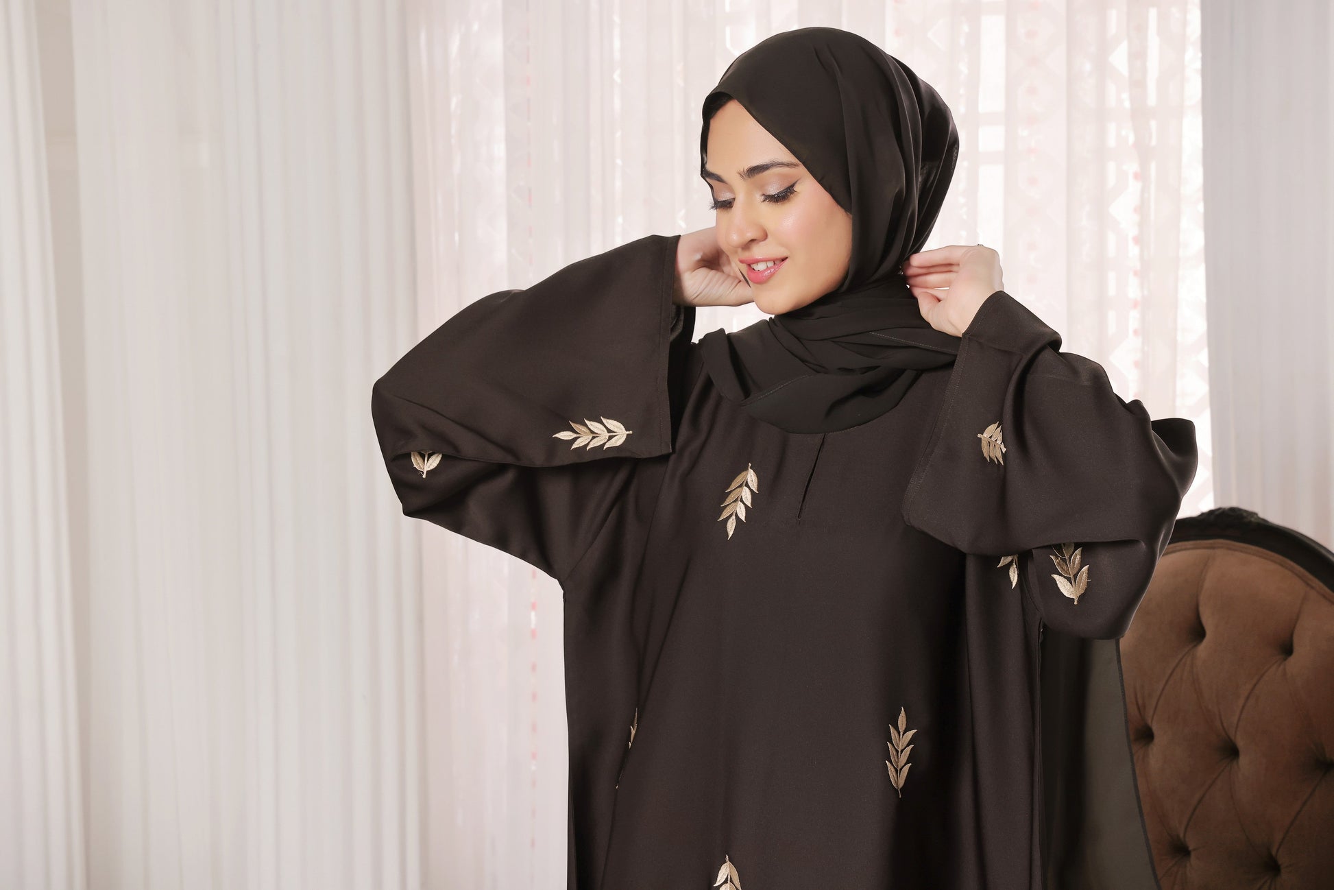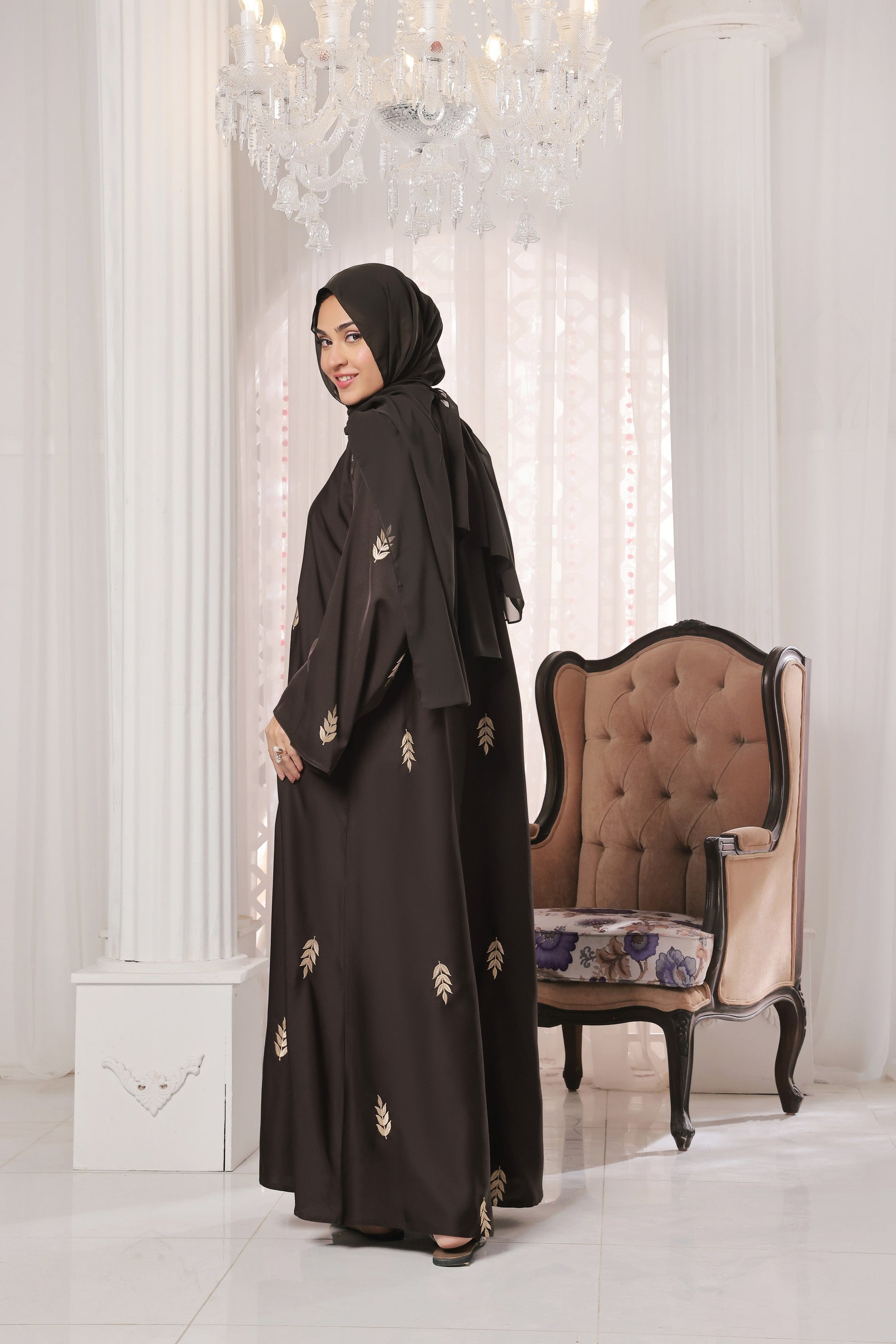 🖤 Elegant Maxi Abaya with Delicate Leaf Embroidery: A beautifully designed abaya featuring soft leaf motifs scattered gracefully across the fabric, creating a subtle yet striking visual appeal.
